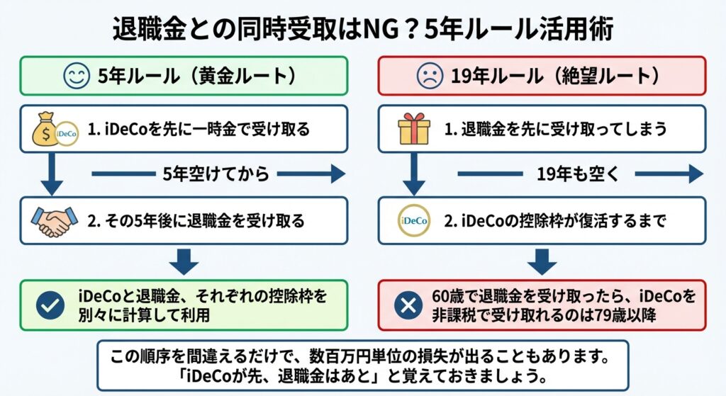 退職所得控除をフル活用するには、「iDeCoを先に受け取り、5年空けてから退職金を受け取る」のが鉄則です。